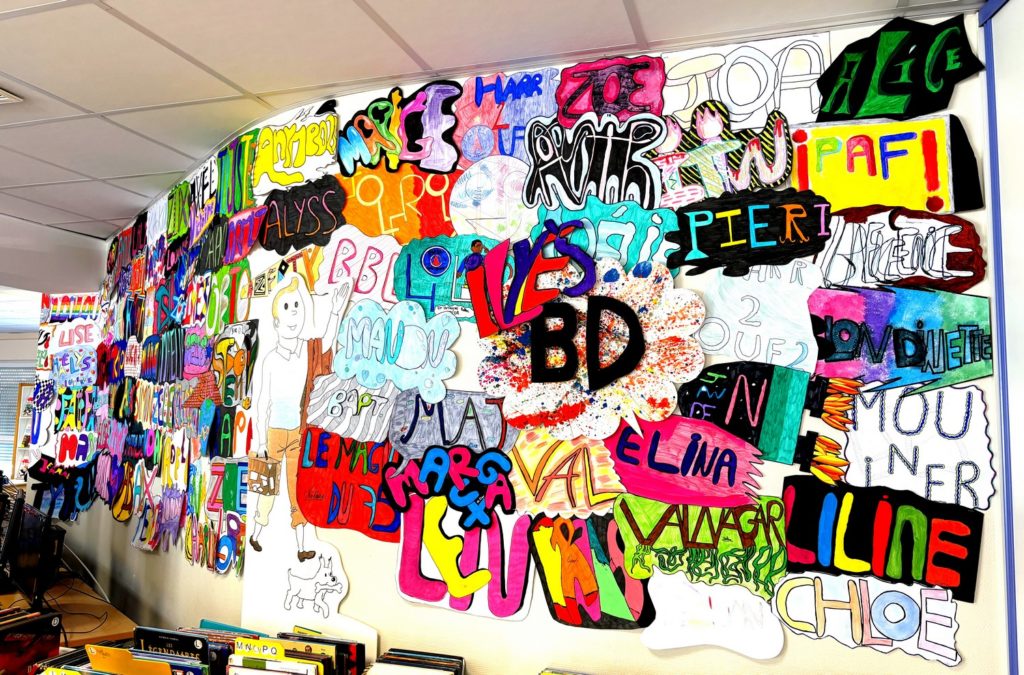Les élèves avaient le choix du mot. Beaucoup ont opté pour leur prénom. Ils devaient travailler sur une grande surface pour le réaliser. Pas si simple que cela de gérer l’espace !